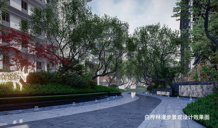 叠拼区晨曦花园、丛林秘境、阳光SPA林、归家庭院四大主题园林空间相映成趣,有机互联,踏出家门便迈进了自然。